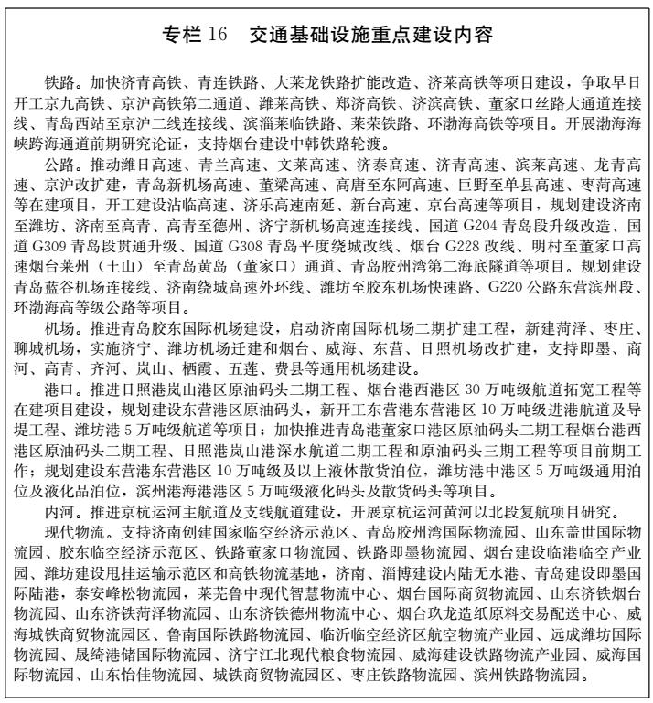 交通基礎(chǔ)設(shè)施。積極融入國(guó)家綜合交通網(wǎng),暢通省內(nèi)外運(yùn)輸網(wǎng)絡(luò),打造交通強(qiáng)國(guó)戰(zhàn)略山東示范區(qū)。鐵路。加快魯南高鐵、濟(jì)萊臨高鐵建設(shè),打造“三環(huán)四橫六縱”的快速鐵路網(wǎng)絡(luò),建設(shè)大萊龍擴(kuò)能改造、聊泰、淄東等鐵路項(xiàng)目,完善“四縱四橫”貨運(yùn)鐵路網(wǎng)。公路。實(shí)施濟(jì)青、京滬(山東段)、沈海(山東段)等大運(yùn)量路段改擴(kuò)建工程,推進(jìn)普通國(guó)省道低標(biāo)準(zhǔn)路段改造,按照一條綜合運(yùn)輸通道至少配置一條免費(fèi)快速干線公路的原則,開(kāi)展全省干線快速路網(wǎng)工程規(guī)劃建設(shè),大力推進(jìn)“四好農(nóng)村路”建設(shè)。軌道交通。推進(jìn)濟(jì)南、青島地鐵和輕軌建設(shè),規(guī)劃建設(shè)淄博、煙臺(tái)、濰坊、濟(jì)寧、臨沂、威海等市軌道交通。機(jī)場(chǎng)。加強(qiáng)民用運(yùn)輸機(jī)場(chǎng)和通用機(jī)場(chǎng)建設(shè),完善機(jī)場(chǎng)布局,提高機(jī)場(chǎng)資源配置效率,構(gòu)建現(xiàn)代民用航空體系。港口。以資本為紐帶、以市場(chǎng)為導(dǎo)向,整合港口資源,帶動(dòng)航運(yùn)協(xié)同合作及一體化運(yùn)營(yíng),打造現(xiàn)代化港口群。按程序成立省港口發(fā)展管理委員會(huì),作為省政府議事協(xié)調(diào)機(jī)構(gòu),對(duì)港口群進(jìn)行統(tǒng)一規(guī)劃,實(shí)現(xiàn)港口間合理分工和良性互動(dòng)。支持各市通過(guò)多種方式參與港口運(yùn)營(yíng),打通出海通道。加快港口公用基礎(chǔ)設(shè)施及大型化、專業(yè)化碼頭建設(shè),推進(jìn)港口內(nèi)部?jī)?yōu)化整合,打造新一代國(guó)際智慧港口。實(shí)施通江達(dá)海內(nèi)河水運(yùn)工程,加強(qiáng)內(nèi)河航道建設(shè),初步形成以京杭運(yùn)河主航道為骨架,其他支流航道為補(bǔ)充的“一干多支”航運(yùn)網(wǎng)絡(luò)和濟(jì)寧港、棗莊港、泰安港等內(nèi)河港口群。支持濟(jì)南優(yōu)化跨黃河橋隧布局。交通與物流融合發(fā)展。發(fā)展智慧物流,鼓勵(lì)有實(shí)力的運(yùn)輸企業(yè)向多式聯(lián)運(yùn)、綜合物流服務(wù)商轉(zhuǎn)變,推進(jìn)國(guó)際貨運(yùn)班列運(yùn)行,打通省內(nèi)外物流大通道,建設(shè)綜合性物流基地和節(jié)點(diǎn)樞紐城市。開(kāi)展國(guó)際中轉(zhuǎn)集拼業(yè)務(wù)和大宗商品國(guó)際中轉(zhuǎn)創(chuàng)新試點(diǎn),支持有條件的市建設(shè)國(guó)家物流標(biāo)準(zhǔn)化城市試點(diǎn)和現(xiàn)代物流創(chuàng)新發(fā)展城市試點(diǎn),發(fā)揮青島膠州灣國(guó)際物流園等國(guó)家示范物流園區(qū)的引領(lǐng)帶動(dòng)作用,提高物流信息化、標(biāo)準(zhǔn)化和集約化水平。