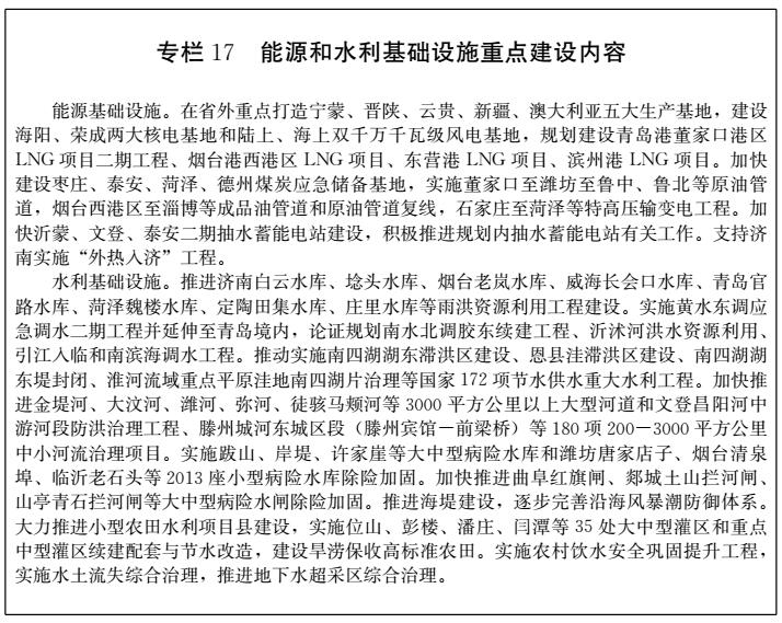 能源基礎(chǔ)設(shè)施。實(shí)施能源保障、能源網(wǎng)絡(luò)和能源優(yōu)化工程,構(gòu)建清潔低碳、安全高效、供應(yīng)優(yōu)化的現(xiàn)代能源體系。能源保障。堅(jiān)持內(nèi)壓外拓,在做好煤炭去產(chǎn)能的基礎(chǔ)上,有序推進(jìn)魯西煤炭基地保護(hù)性開(kāi)發(fā)。穩(wěn)定開(kāi)發(fā)油氣資源,有序推進(jìn)近海油氣田和頁(yè)巖油開(kāi)發(fā),加快國(guó)家骨干油氣管網(wǎng)和沿海LNG接收站規(guī)劃建設(shè),充分利用省外、境外油氣資源。實(shí)施煤電提升改造,通過(guò)“上大壓小”適度發(fā)展大型高效、節(jié)能環(huán)保煤電機(jī)組,加快現(xiàn)役機(jī)組超低排放和節(jié)能環(huán)保升級(jí)改造。加快新能源和可再生能源發(fā)電發(fā)展,實(shí)施光伏發(fā)電示范工程,統(tǒng)籌陸上和海上風(fēng)電開(kāi)發(fā),合理布局生物質(zhì)和垃圾發(fā)電項(xiàng)目。能源儲(chǔ)輸網(wǎng)絡(luò)。統(tǒng)籌省外能源引進(jìn)和省內(nèi)產(chǎn)需銜接,構(gòu)筑煤炭主要運(yùn)輸網(wǎng)絡(luò)。對(duì)接西氣東輸、中俄東線等國(guó)家骨干輸氣工程,加強(qiáng)國(guó)家原油戰(zhàn)略儲(chǔ)備基地建設(shè)。持續(xù)提高電網(wǎng)調(diào)峰能力,保障安全穩(wěn)定運(yùn)行。能源優(yōu)化。嚴(yán)格實(shí)行能耗強(qiáng)度和總量“雙控”制度,努力壓減省內(nèi)煤炭消費(fèi)總量,逐步降低煤炭消費(fèi)比重。實(shí)施“氣化山東”工程,積極推進(jìn)天然氣在工業(yè)、交通、發(fā)電、供暖等領(lǐng)域高效利用。大幅提高新能源和可再生能源利用規(guī)模,推動(dòng)綠色電力、綠色熱力、綠色燃料生產(chǎn)與應(yīng)用。