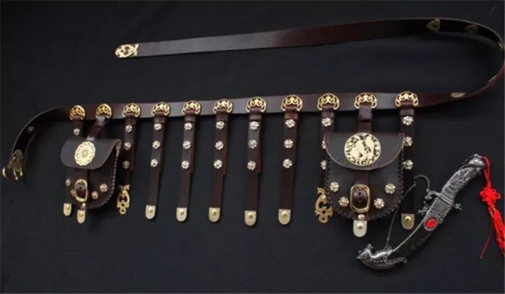 《新唐書》中有關(guān)于服裝形制的記載,唐人常配有一種叫蹀躞(dié xiè)七事的腰帶,上面掛著七種不同用處的物件,哪七種?分別為:佩刀、刀子、礪石、契苾真、噦厥、針筒、火石。這個(gè)噦厥(yuě jué),就是我們生活中常見(jiàn)的垃圾袋。