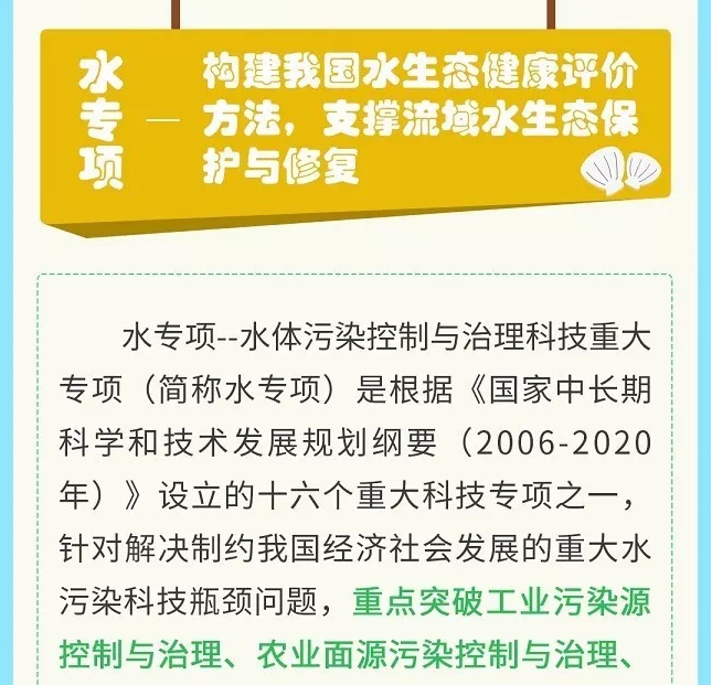 水專項——水體污染控制與治理科技重大專項(簡稱水專項)是根據(jù)《國家中長期科學和技術發(fā)展規(guī)劃綱要(2006-2020年)》設立的十六個重大科技專項之一,針對解決制約我國經濟社會發(fā)展的重大水污染科技瓶頸問題。