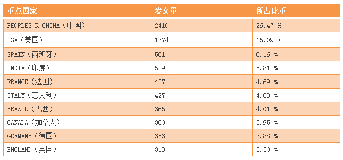 表1 論文數(shù)量排名前10位的國(guó)家(2012-2016年)發(fā)文情況