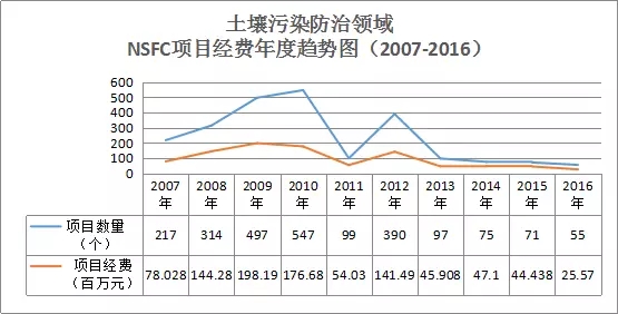 通過統(tǒng)計(jì)2007-2016十年內(nèi)我國(guó)國(guó)家自然科學(xué)基金的項(xiàng)目數(shù)據(jù),可知土壤污染防治領(lǐng)域的項(xiàng)目經(jīng)費(fèi)在2007-2010年呈穩(wěn)步上升趨勢(shì),2010年申請(qǐng)通過的項(xiàng)目達(dá)峰值547個(gè),2011年有所回落,2012年又激增到390個(gè),之后幾年呈現(xiàn)了下降趨勢(shì),2016年僅通過55個(gè)項(xiàng)目,經(jīng)費(fèi)也隨之下降,如圖9所示。