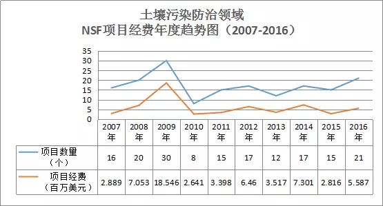 通過項(xiàng)目數(shù)據(jù)分析(見圖12),在土壤污染防治領(lǐng)域,美國(guó)國(guó)家科學(xué)基金資助經(jīng)費(fèi)在2007年至2009年呈現(xiàn)了穩(wěn)步遞增的趨勢(shì),2009年項(xiàng)目數(shù)量達(dá)到峰值30個(gè)。2010年出現(xiàn)拐點(diǎn),項(xiàng)目數(shù)量下降為8個(gè),2011年又開始回升,之后5年一直較為平穩(wěn),2016年有所增加,達(dá)到21個(gè)。