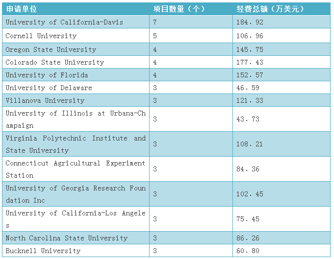 根據(jù)統(tǒng)計(jì),本領(lǐng)域申請(qǐng)年份在2007年至2016年間,共有135個(gè)機(jī)構(gòu)申請(qǐng)了美國(guó)國(guó)家科學(xué)基金。其中申請(qǐng)數(shù)量超過2個(gè)的機(jī)構(gòu)有14個(gè)獲得經(jīng)費(fèi)約為1496.8萬美元,如表9所示。