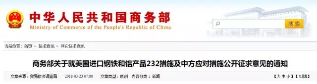商務(wù)部關(guān)于就美國(guó)進(jìn)口鋼鐵和鋁產(chǎn)品232措施及中方應(yīng)對(duì)措施公開征求意見的通知