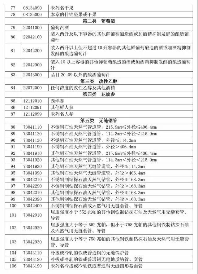 該清單暫定包含7類、128個(gè)稅項(xiàng)產(chǎn)品,按2017年統(tǒng)計(jì),涉及美對(duì)華約30億美元出口。第一部分共計(jì)120個(gè)稅項(xiàng),涉及美對(duì)華9.77億美元出口,包括鮮水果、干果及堅(jiān)果制品、葡萄酒、改性乙醇、花旗參、無(wú)縫鋼管等產(chǎn)品,擬加征15%的關(guān)稅。第二部分共計(jì)8個(gè)稅項(xiàng),涉及美對(duì)華19.92億美元出口,包括豬肉及制品、回收鋁等產(chǎn)品,擬加征25%的關(guān)稅。