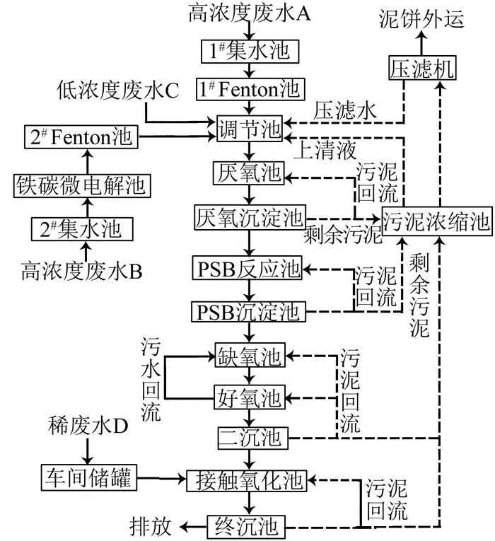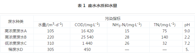 河北省某化工企業(yè)主要生產有機顏料,廢水來源主要是工藝廢水、廢氣吸收廢水、地面沖洗水、生活污水等。廢水按水質可以分為4大類:第1類為高濃度廢水A(COD高、鹽分低),主要來源于精制廢水、濾洗廢水、粗品車間廢水,主要污染物為COD、苯系物等;第2類為高濃度廢水B(COD高、鹽分高),主要來源于結晶過濾廢水、濾洗廢水、精餾塔頂流出液、廢氣吸收廢水、粗品車間廢水、母液,主要污染物為COD、苯系物、二氯乙烷、二甲基甲酰胺、水合肼、鹽分等;第3類為低濃度廢水C,主要來源于消化廢水、水沖泵廢水、地面沖洗廢水、蒸餾放料槽廢水、蒸汽尾水、生活污水,主要污染物為COD、SS、氨氮、總磷、苯系物等;第4類為稀廢水D,主要來源于產品洗水,主要污染物為COD、SS等。根據廢水水質不同先分質處理,再合并處理。最終處理出水執(zhí)行《污水排入城鎮(zhèn)下水道水質標準》(CJ 343—2010)的B等級標準。各類廢水水質水量如表 1所示。