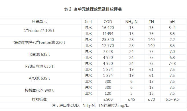 電費:電價0.7元/(kW˙h),電費成本2.82元/m3。人工費:3人,平均每人3 000元/月,人工成本0.32元/m3。藥劑費:聚丙烯酰胺消耗量0.1 kg/m3,聚丙烯酰胺成本0.86元/m3;雙氧水消耗量10 kg/m3,雙氧水成本3.10元/m3;硫酸亞鐵消耗量1 kg/m3,硫酸亞鐵成本0.17元/m3;硫酸消耗量1 kg/m3,硫酸成本0.17元/m3;鐵碳微電解填料消耗量0.4 kg/m3,填料成本1.17元/m3;液堿消耗量7 kg/m3,液堿成本1.94元/m3;復配劑消耗量0.5 kg/m3,復配劑成本3.5元/m3;營養(yǎng)劑成本0.8元/m3;PSB系統(tǒng)光合細菌培養(yǎng)成本0.3元/m3;自來水成本0.13元/m3。綜合電費、人工費、藥劑費,總運行成本15.28元/m3。