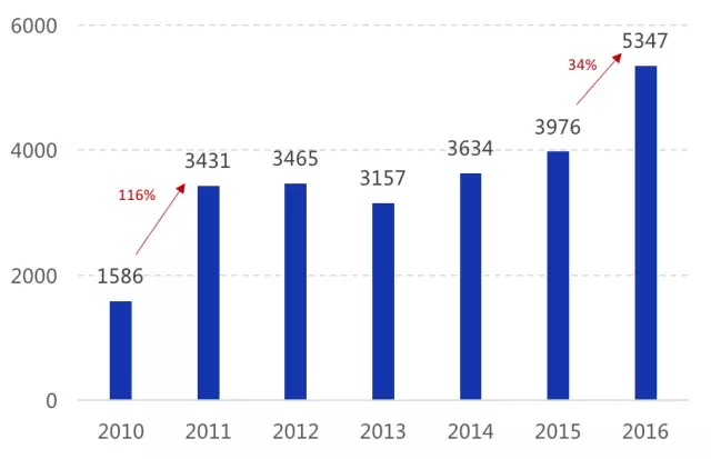資質(zhì)企業(yè)平均規(guī)模較?。?016年我國持危險廢棄物經(jīng)營許可證的企業(yè)數(shù)量為2149家,2016年凈增加僅115家,體現(xiàn)出環(huán)保系統(tǒng)對新頒發(fā)許可證愈發(fā)謹慎;平均每家處理量僅不到3萬噸,呈現(xiàn)較強的分散性特征,但單企業(yè)處理規(guī)模由2014年2.2萬噸/年增加到2016年3.0萬噸/年,未來隨著許可證頒發(fā)與復(fù)核難度加大,實力弱、技術(shù)差的小企業(yè)將被淘汰出市場,龍頭擴張,單企業(yè)規(guī)模繼續(xù)擴大。