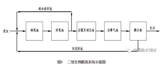 事實(shí)上經(jīng)過(guò)單級(jí)生物脫氮處理后,出水中仍會(huì)含有一定量的硝酸鹽,尤其是進(jìn)水氨氮濃度高的情況下,出水中硝酸鹽的含量會(huì)更高,總氮也相應(yīng)偏高。在出水對(duì)總氮有嚴(yán)格要求的地區(qū),為保證出水總氮達(dá)標(biāo),在單級(jí)生物脫氮后再增設(shè)后置反硝化池和后曝氣池,亦即二級(jí)生物脫氮系統(tǒng),通過(guò)投加外加碳源,利用微生物的硝化和反硝化反應(yīng)進(jìn)一步去除剩余的硝酸鹽,進(jìn)而達(dá)到提高總氮去除率的目的。