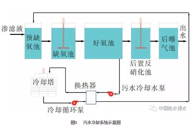 由于高濃度污水在生化反應(yīng)過(guò)程中會(huì)釋放出大量的熱能,同時(shí)由于部分電能轉(zhuǎn)化成熱能的緣故,垃圾滲濾液處理生物池內(nèi)會(huì)保持較高的溫度,過(guò)高的水溫會(huì)抑制微生物的活性,嚴(yán)重時(shí)會(huì)使生化處理系統(tǒng)癱瘓。因此垃圾滲濾液生化處理均設(shè)有污水冷卻系統(tǒng),用污水泵抽取生物池內(nèi)的混合液進(jìn)入換熱器,與冷卻水在換熱器內(nèi)進(jìn)行熱交換,降溫后混合液再回到生物池內(nèi),從而達(dá)到降低生物池內(nèi)水溫的目的。