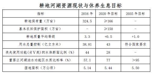 到2020年,耕地數(shù)量穩(wěn)定、質(zhì)量提高,河湖生態(tài)空間有效恢復(fù),濕地面積增加,耕地河湖生態(tài)功能有效改善,資源有效保護和高效利用的政策與技術(shù)支撐體系基本建立。到2035年,耕地河湖資源利用與養(yǎng)護全面步入良性循環(huán),資源休養(yǎng)生息制度體系更加完善,形成資源利用高效、生態(tài)系統(tǒng)穩(wěn)定、農(nóng)業(yè)可持續(xù)發(fā)展、水生態(tài)環(huán)境優(yōu)良的新格局,實現(xiàn)人與自然和諧共生。