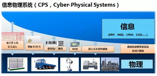 按照德國人的理解,智能化的標志,主要通過信息物理系統(tǒng)和人工智能實現(xiàn)生產(chǎn)制造的智能化。信息物理系統(tǒng)簡稱CPS,S就是信息,P就是物理,硬件生產(chǎn)設(shè)備,C是軟件信息化,以前信息物理差距比較大,工作人員要手工錄入信息,工廠里面是數(shù)據(jù)采集、數(shù)字控制,還需要人為往信息系統(tǒng)錄入。