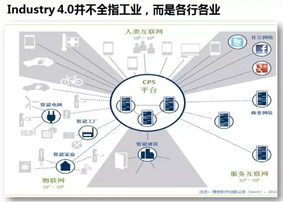 我們國家理解工業(yè)4.0有一定的偏差,因為工業(yè)4.0這個詞我們國家翻譯成工業(yè),實際上日本和德國包括美國認為是產(chǎn)業(yè)的意思。按照它們的理解,工業(yè)是工業(yè)化、智能制造,農(nóng)業(yè)變成智慧農(nóng)業(yè),建筑也是信息化加上建筑工業(yè)化、自動化,形成智慧建筑,醫(yī)療也是智能化、智慧醫(yī)療。實際,德國人搞工業(yè)4.0不僅是工業(yè)領(lǐng)域,而是各行各業(yè)的智能化。