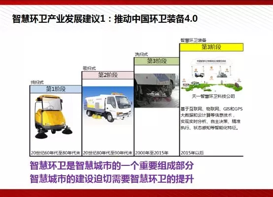 第一,推動中國環(huán)衛(wèi)裝備4.0。以馬路清掃機為例,60天年末是第一階段,純掃式的,80年代到90年代末有吸式,把土吸進去,有了新的進行。2000年到2015年可以一邊掃一邊洗,未來是智慧環(huán)衛(wèi)階段?;锫?lián)網(wǎng)、GDP等信息技術(shù)實現(xiàn)時時分析、精準執(zhí)行。未來環(huán)衛(wèi)裝備也要過渡到4.0。