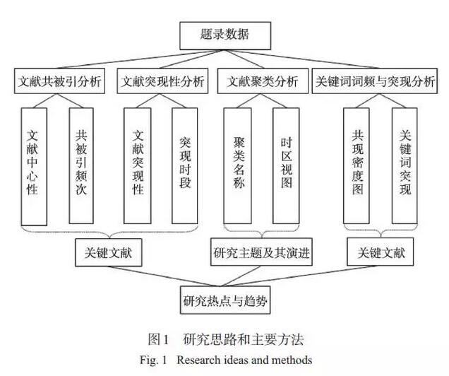通過文獻(xiàn)共被引發(fā)現(xiàn)關(guān)鍵文獻(xiàn),進(jìn)一步通過文獻(xiàn)聚類分析,解讀土壤質(zhì)量研究主題的演進(jìn)規(guī)律及其驅(qū)動(dòng)因素;結(jié)合文獻(xiàn)突現(xiàn)分析、關(guān)鍵詞突現(xiàn)分析展現(xiàn)研究熱點(diǎn)的變遷,并發(fā)現(xiàn)未來的研究趨勢(圖 1)。在本研究中,Citespace V參數(shù)設(shè)置具體如下:時(shí)間段為1992—2016 年,以1 a 為時(shí)間切片,節(jié)點(diǎn)類型分別選擇被引文獻(xiàn)和關(guān)鍵詞,文獻(xiàn)選取標(biāo)準(zhǔn)為每個(gè)時(shí)間切片內(nèi)被引量前50 的文章,選擇尋徑剪枝方式。