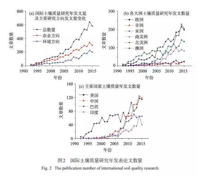 進(jìn)入20 世紀(jì)90 年代以來,國際上對土壤質(zhì)量的研究熱度不斷升高,相關(guān)文獻(xiàn)呈井噴式出現(xiàn)。國際土壤質(zhì)量研究年發(fā)文總量在1992—2008 年左右呈緩慢上升狀態(tài),2008 年之后呈現(xiàn)快速發(fā)展?fàn)顟B(tài)[圖2(a)],而土壤質(zhì)量研究的兩個(gè)主要方向(WOS給出) 農(nóng)業(yè)方向和環(huán)境方向的關(guān)注度也在不斷升溫,土壤質(zhì)量研究相對更偏向農(nóng)業(yè)方向。非洲和澳洲的土壤質(zhì)量研究相對較少,北美則起步較早[圖2(b)],在20 世紀(jì)90 年代初開展了較多關(guān)于土壤質(zhì)量方面的研究,2005 年之后,歐洲對土壤質(zhì)量的關(guān)注度迅速升溫,這是由于歐洲面臨嚴(yán)重的土壤退化問題,北美地區(qū)則發(fā)展速度放緩。亞洲和南美洲在該領(lǐng)域的研究起步較晚,2008 年之后發(fā)展速度加快,其中以亞洲最為突出。中國、印度、巴西作為發(fā)展中國家在土壤質(zhì)量方面研究起步晚,但后期發(fā)展加快;美國起步較早,前期開展了大量研究,后期速度變緩;中國在土壤質(zhì)量研究領(lǐng)域異軍突起,近幾年發(fā)文數(shù)量已超越美國[圖2(c)]。
