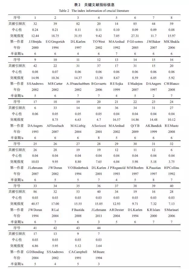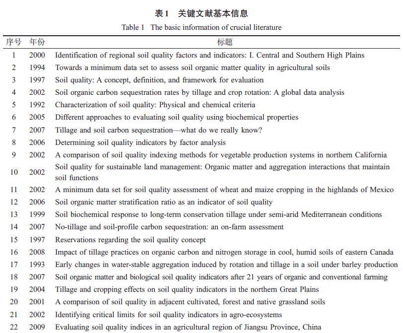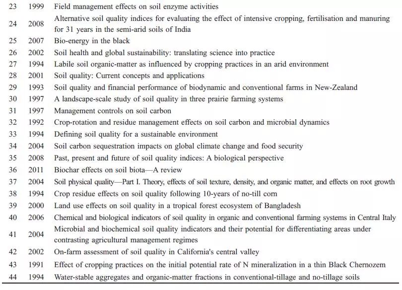 經(jīng)典文獻(xiàn)都密切關(guān)注了文獻(xiàn)發(fā)表時(shí)期該領(lǐng)域發(fā)展的熱點(diǎn)問題,因其較高的社會關(guān)注度、創(chuàng)新性和系統(tǒng)性,從而引發(fā)其他學(xué)者大量引用。通過對44 篇經(jīng)典文獻(xiàn)內(nèi)容的分析,2000 年以前多關(guān)注農(nóng)業(yè)管理措施對有機(jī)質(zhì)的影響和土壤質(zhì)量的概念,2000 年以后,對土壤質(zhì)量評價(jià)方法、評價(jià)指標(biāo)尤其是生物學(xué)指標(biāo)的研究不斷興起,更多地注重土壤質(zhì)量在農(nóng)業(yè)和環(huán)境方面的應(yīng)用,2008 年以來,關(guān)于土壤質(zhì)量與全球氣候變化、土壤修復(fù)的關(guān)系研究受到更多學(xué)者關(guān)注。從整個(gè)過程來看,土壤質(zhì)量從概念的產(chǎn)生到廣泛的應(yīng)用,一直圍繞農(nóng)業(yè)與環(huán)境的可持續(xù)發(fā)展,這也是人類可持續(xù)發(fā)展的主題之一。
