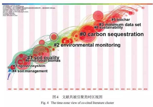 本研究中所認(rèn)為的“研究主題”是指在一定時(shí)段內(nèi),眾多學(xué)者探討和解決的中心問題,Citespace V通過對文獻(xiàn)共被引的分析,將研究內(nèi)容相似的文獻(xiàn)進(jìn)行歸類并命名。通過對5 551 篇文獻(xiàn)進(jìn)行共被引分析,共獲取28 個(gè)聚類,如果聚類中文獻(xiàn)數(shù)量較少,則會影響其命名的準(zhǔn)確性,因此本研究選取文獻(xiàn)數(shù)量在30 篇以上的8 個(gè)聚類進(jìn)一步分析,聚類的時(shí)間分布和命名見圖 4。通過圖4 可以發(fā)現(xiàn),研究早期(2000 年以前) 主題較為分散,主要集中在土壤管理(#4)、農(nóng)業(yè)生態(tài)系統(tǒng)(#7)、微生物生物量(#6)、土壤質(zhì)量概念(#1) 等方面,2000 年以來,環(huán)境監(jiān)測(#2)、碳匯(#0) 研究最多,另外近幾年焦點(diǎn)聚集在可持續(xù)性(#8)、最小數(shù)據(jù)集(#3)、生物炭(#5) 上。