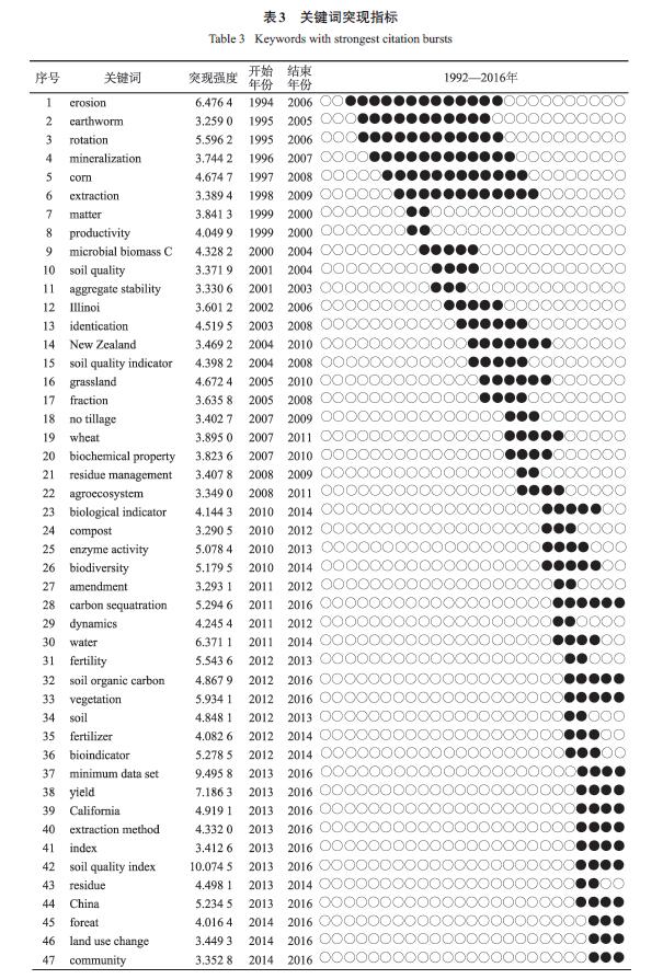 土壤質(zhì)量概念的產(chǎn)生與發(fā)展有著深刻的時(shí)代背景和需求。人類發(fā)展的階段性和動(dòng)態(tài)性、全球氣候變化與人類活動(dòng)影響的加劇、學(xué)科的不斷交融是決定土壤質(zhì)量主題演變的主要因素。土壤質(zhì)量在20 多年的發(fā)展階段中,涌現(xiàn)了一些標(biāo)志性的經(jīng)典文獻(xiàn),引發(fā)了大量學(xué)者關(guān)注,從而產(chǎn)生了新的研究點(diǎn)。依據(jù)Citespace V理論和分析結(jié)果,本文著重對文獻(xiàn)中心性高于0.03、突現(xiàn)性高于4、共被引頻次大于30 的關(guān)鍵文獻(xiàn)進(jìn)行分析,綜合以上量化指標(biāo),對該領(lǐng)域研究熱點(diǎn)及其變遷進(jìn)行了解析。在研究趨勢方面,截取突現(xiàn)性大于4,開始年份為2011年,結(jié)束年份為2016年的關(guān)鍵詞進(jìn)行了分析。
