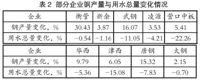 2017年有22家企業(yè)鋼產(chǎn)量增長,但用水總量下降,這是企業(yè)用水和節(jié)水工作取得的好成績,部分企業(yè)情況見表2。