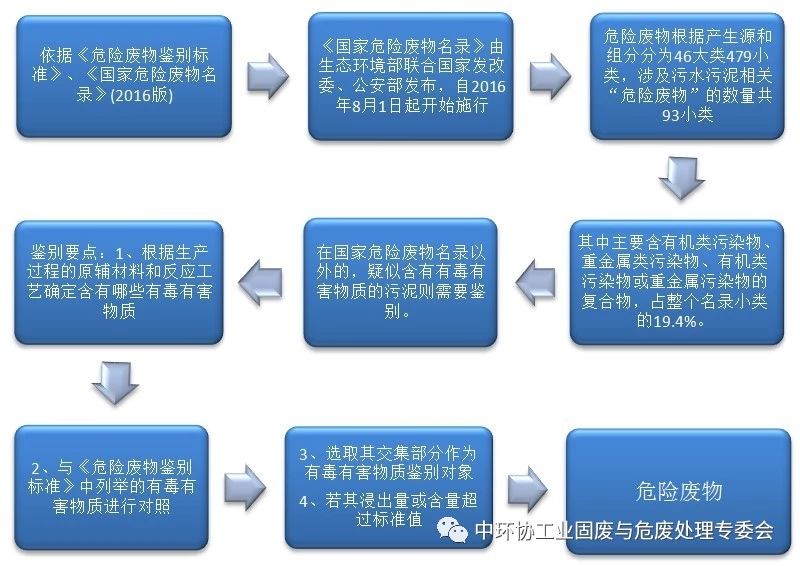 污水污泥是指在污水處理過程中產(chǎn)生的半固態(tài)或固態(tài)物質(zhì)。就環(huán)境保護(hù)關(guān)注的問題而言,污水污泥幾乎集聚了污水中所有污染物。按其來源分為工業(yè)污水污泥、生活污水污泥。工業(yè)污水污泥按照管理屬性又分為危險(xiǎn)廢物和一般工業(yè)固體廢物。依據(jù)由環(huán)境保護(hù)部聯(lián)合國家發(fā)改委、公安部發(fā)布自2016年8月1日起開始施行的《國家危險(xiǎn)廢物名錄》和《危險(xiǎn)廢物鑒別標(biāo)準(zhǔn)》,結(jié)合住建部、環(huán)保部、科技部于2009年2月28日聯(lián)合發(fā)布的《城鎮(zhèn)污水處理廠污泥處理處置及污染防治技術(shù)政策(試行)》,五步即可判定污水污泥是否屬于危險(xiǎn)廢物,如下圖所示: