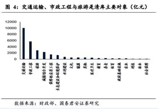 清庫較為集中的行業(yè)主要包括交通運輸與市政工程:分別占清庫總金額的 36%和 20%。傳統(tǒng)市政道路施工與城鎮(zhèn)開發(fā)等,由于不具有明確的績效掛鉤機制,本次清庫中首當其沖。