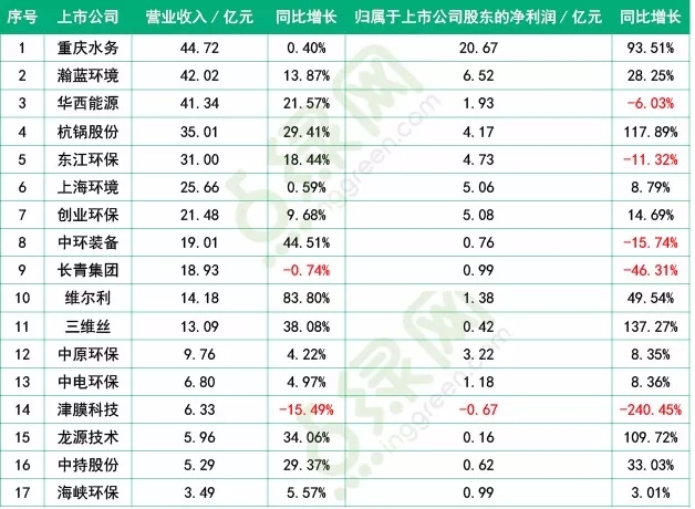 截止4月3日止共有17家環(huán)保上市公司發(fā)布2017年年報(bào)(其余將繼續(xù)跟進(jìn))。2017年?duì)I收排名靠前重慶水務(wù)、瀚藍(lán)環(huán)境、華西能源均在40億以上,營收僅津膜科技和長青集團(tuán)同比下降。