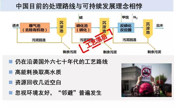 這條路線將污水視為污染物,以大占地、長(zhǎng)流程、高能耗、高物耗的代價(jià),去獲取有限指標(biāo)的達(dá)標(biāo)排放,同時(shí)產(chǎn)生大量污泥、噪聲、臭氣,在城市生活中已成為令人嫌棄的存在。