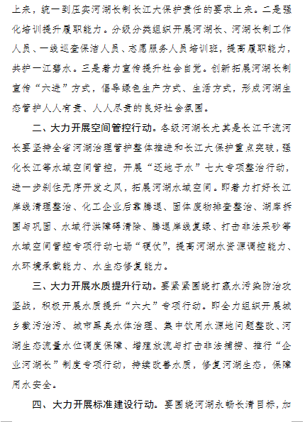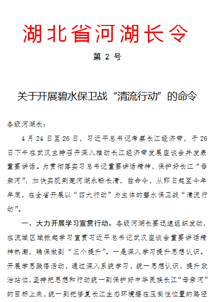 5月9日,湖北省發(fā)布第2號省河湖長令,要求全省各級河湖長立刻行動,從即日起至今年年底,在全省開展以“四大行動”為主體的碧水保衛(wèi)戰(zhàn)“清流行動”,以貫徹落實習近平總書記在武漢主持召開深入推動長江經濟帶發(fā)展座談會重要講話精神,保護好長江“母親河”,加快實現荊楚河湖永暢長清。