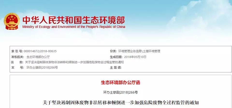 生態(tài)環(huán)境部日前印發(fā)了《關(guān)于堅(jiān)決遏制固體廢物非法轉(zhuǎn)移和傾倒 進(jìn)一步加強(qiáng)危險(xiǎn)廢物全過(guò)程監(jiān)管的通知》(環(huán)辦土壤函〔2018〕266號(hào),以下簡(jiǎn)稱(chēng)《通知》)。