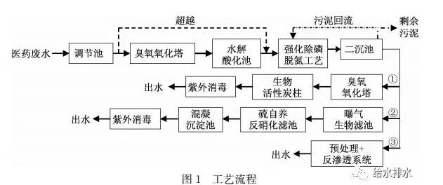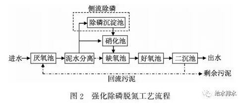 醫(yī)藥廢水通過(guò)預(yù)處理單元后進(jìn)入強(qiáng)化除磷脫氮工藝的厭氧池,與回流污泥在厭氧池中混合,然后混合液進(jìn)入泥水分離池,在泥水分離池進(jìn)行分離,上清液的20%~30%進(jìn)入除磷沉淀池進(jìn)行化學(xué)除磷,其余上清液泵送進(jìn)入硝化池,污泥與硝化池的硝化液在缺氧池混合,之后泥水混合液進(jìn)入好氧池(后曝氣池),經(jīng)二沉池沉淀后出水進(jìn)入深度處理單元。