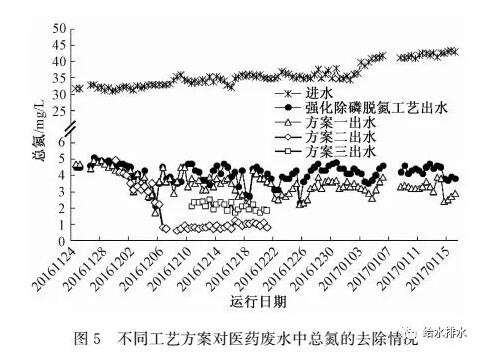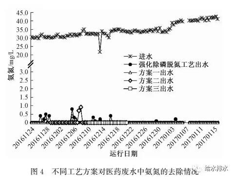 由圖4可以看出,由于醫(yī)藥廢水混合后中氮的濃度較低,在運(yùn)行期間會(huì)投加10~15 mg/L的氯化銨來(lái)調(diào)整進(jìn)水NH3-N濃度并控制在30~40 mg/L。系統(tǒng)運(yùn)行穩(wěn)定后,平均出水NH3-N低于0.1 mg/L,對(duì)于NH3-N的平均去除率已達(dá)到99%以上。由于強(qiáng)化除磷脫氮工藝具有較優(yōu)的硝化效果,NH3-N主要在前端的生物處理單元去除,出水NH3-N濃度較低在0~0.8 mg/L,方案一~方案三出水NH3-N濃度均低于0.1 mg/L。出水滿(mǎn)足IV類(lèi)水標(biāo)準(zhǔn)限值要求(NH3-N≤1.5 mg/L)。