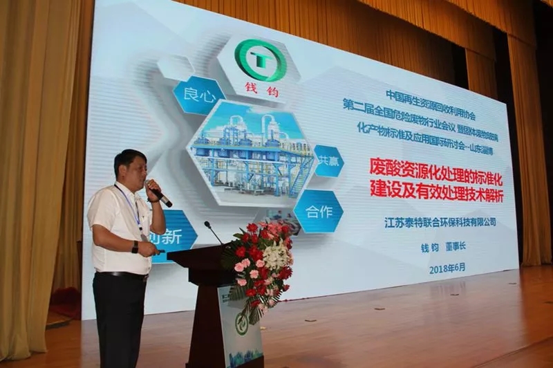 江蘇泰特聯(lián)合環(huán)??萍加邢薰径麻L(zhǎng)錢鈞以“廢酸資源化處理的標(biāo)準(zhǔn)化建設(shè)及有效處理技術(shù)解析”為主題,概述了廢酸資源化處理的緊迫性及標(biāo)準(zhǔn)化建設(shè)發(fā)展方向,梳理出涉及到的相關(guān)政策法規(guī),并分享了泰特公司鋼制品鹽酸酸洗廢液的有效處理技術(shù)。