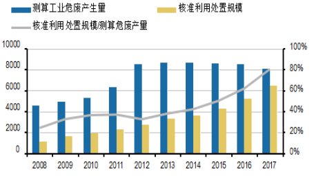 據(jù)國家統(tǒng)計局數(shù)據(jù)顯示,2017年我國危險廢物產(chǎn)生量5340萬噸,較去年增長34.49%。其中綜合利用2800萬噸,處置1600萬噸,綜合處置利用率高達83%。