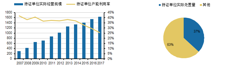 目前持證單位產(chǎn)能利用率僅25%。據(jù)《大中城市固廢污染防治年報2017》顯示,2017年我國持證單位危廢處置量僅1629萬噸,總產(chǎn)能6471萬噸,產(chǎn)能利用率25%。