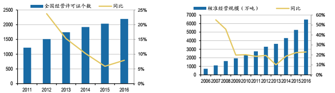 自2006年以來,我國危廢經(jīng)營許可證發(fā)放數(shù)量增速呈下降趨勢。嚴格的資質(zhì)管理制度是危廢處理行業(yè)最重要的行業(yè)壁壘,并在一定程度上限制了危廢處理產(chǎn)能的快速擴張。