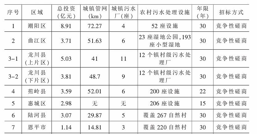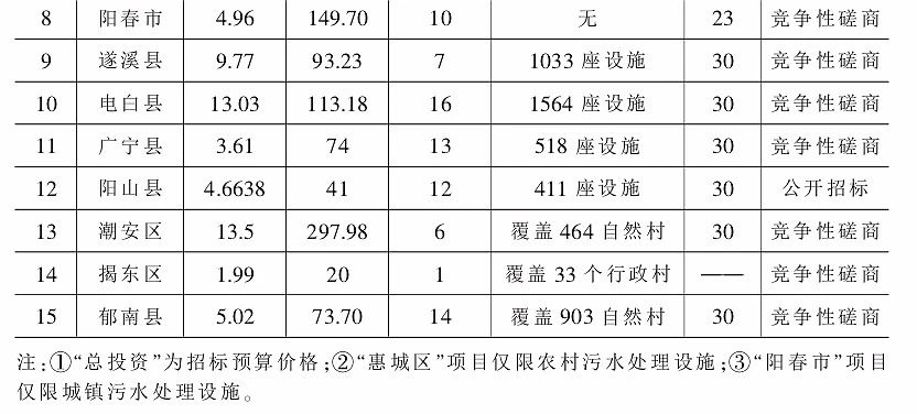 15個(gè)示范縣項(xiàng)目的統(tǒng)計(jì)數(shù)據(jù)顯示:(1)項(xiàng)目投資額在1-13.5億元之間;(2)項(xiàng)目PPP合作年限在15-30年之間;(3)大部分項(xiàng)目“城鎮(zhèn)與農(nóng)村”捆綁打包;(4)項(xiàng)目城鎮(zhèn)污水處理設(shè)施與配套管網(wǎng)共建。
