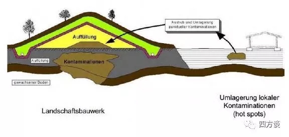 (2)隔離封閉,把污染物集中并用隔離膜封閉(Sicherungsmassnahmen)。當(dāng)污染物污染比較嚴(yán)重,分布范圍大、深,且對(duì)地下水也已經(jīng)造成污染,這種情況下,對(duì)污染源進(jìn)行清挖、換土費(fèi)用太高,一般選擇就地隔離封閉處理,阻止污染物進(jìn)一步向外擴(kuò)散。具體做法是:把場(chǎng)地的污染土壤集中在一起,堆成山丘,鋪上隔離層(一種很厚的塑料膜,使用壽命100余年),以免繼續(xù)污染地下水或者空氣。在隔離層之上鋪大約2米厚的可供植物生長(zhǎng)的新土層,進(jìn)行景觀再造,改造成為休閑場(chǎng)所,如圖2所示。