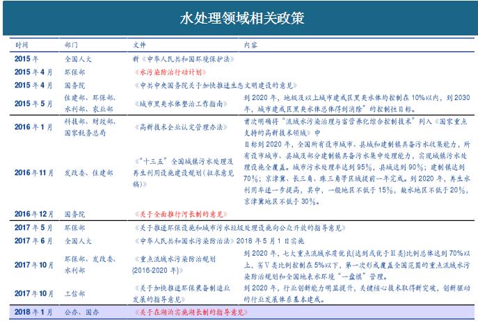 (簡(jiǎn)稱水十條)。而在2016年“河長(zhǎng)制”正式頒布,從水治理體制層面實(shí)現(xiàn)創(chuàng)新,明確了地方主體責(zé)任和河湖管理保護(hù)各項(xiàng)任務(wù);2017年水治理領(lǐng)域個(gè)細(xì)分領(lǐng)域細(xì)則逐步出臺(tái),對(duì)于污水治理、黑臭水體、海綿城市等細(xì)分領(lǐng)域提出具體要求,水治理開始走向綜合化和混合型;2018年開年出臺(tái)“湖長(zhǎng)制”,“河湖雙治”全國(guó)一盤棋有望在2018年實(shí)現(xiàn),國(guó)家對(duì)湖泊生態(tài)環(huán)境的監(jiān)管、保護(hù)和治理力度正在逐步升級(jí),湖泊水域的生態(tài)環(huán)境保護(hù)制度將更加明確和細(xì)化。