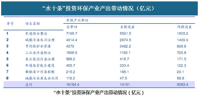 根據(jù)《水十條》提出的任務(wù)措施,將實(shí)施包括工業(yè)污染防治、城鎮(zhèn)生活污染治理、農(nóng)業(yè)農(nóng)村污染防治等在內(nèi)的8類工程項(xiàng)目。具體細(xì)分水治理項(xiàng)目,環(huán)境綜合治理項(xiàng)目對(duì)環(huán)保產(chǎn)業(yè)的帶動(dòng)作用最強(qiáng),主要涉及城市黑臭水體治理,地表水飲用水源環(huán)境保護(hù)、防治地下水污染、地表水水質(zhì)保持、水質(zhì)良好水體及入海河流劣Ⅴ類消除等工程措施?!端畻l》還將帶動(dòng)與水環(huán)境產(chǎn)業(yè)相關(guān)的其他行業(yè)發(fā)展,如水環(huán)境金融、建筑、儀器設(shè)備、塑料橡膠、專用化學(xué)品、電子計(jì)算機(jī)、軟件、物流等相關(guān)產(chǎn)品及服務(wù)。