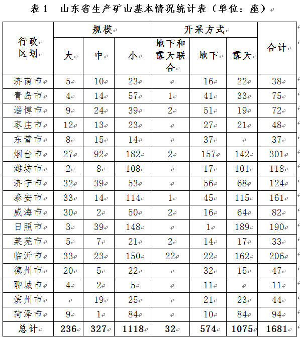 截至2017年,全省已發(fā)現(xiàn)礦產(chǎn)148種,查明資源儲量的有85種。其中,煤、石油、天然氣、地熱等能源礦產(chǎn)7種,金、鐵、銅等金屬礦產(chǎn)25種,石灰?guī)r、花崗巖、石墨、石膏、滑石等非金屬礦產(chǎn)50種,地下水、礦泉水等水汽礦產(chǎn)3種。全省開發(fā)利用礦產(chǎn)60余種(含亞礦種),主要開采礦種為石油、煤、金、鐵、石灰?guī)r、花崗巖等,全省共有各類生產(chǎn)礦山1681座(包括62座在建礦山)(表1),歷史遺留礦山(包括廢棄、政策性關(guān)閉及閉坑礦山)7991座(表2)。