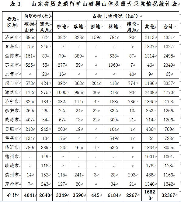 全省露天開采礦種主要有石灰?guī)r、花崗巖、磚瓦用粘土等非金屬建筑材料礦產(chǎn),在開采過程中造成了地形地貌景觀破壞,也占壓和損毀了大量的土地資源。目前,全省尚有破損山體4706處、露天采坑3109處,占損土地資源總計4.28萬公頃。其中,歷史遺留礦山破損山體4041處、露天采坑2640處,占損土地資源3.24萬公頃,主要分布在濟南、煙臺、濰坊、臨沂等地(表3);生產(chǎn)礦山造成的破損山體665處、露天采坑469處,占損土地資源1.04萬公頃,主要分布在煙臺、泰安、臨沂等地。