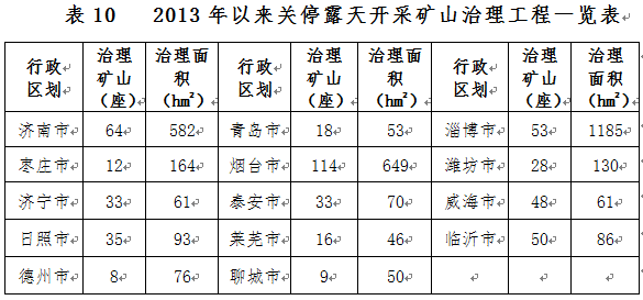 2013年以來全省關(guān)停露天開采礦山1539座,已治理礦山267座,未治理礦山1272座。部署到2020年治理礦山518座,治理面積0.33萬公頃(含“三區(qū)兩線”可視范圍內(nèi)歷史遺留礦山0.09萬公頃),主要分布于濟南、淄博、煙臺等地(表10)。