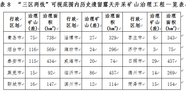 部署開展“三區(qū)兩線”可視范圍內(nèi)歷史遺留露天開采礦山地質(zhì)環(huán)境治理工程,到2020年治理歷史遺留露天開采礦山577座,治理面積0.45萬公頃,主要分布于青島、煙臺、泰安、日照、臨沂等地(表8)。