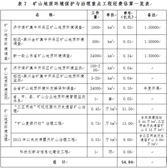 在濟寧煤礦集中開采區(qū)、招遠-萊州金礦集中開采區(qū)開展礦山地質(zhì)環(huán)境專項調(diào)查,在全省開展新一輪礦山地質(zhì)環(huán)境詳細調(diào)查。調(diào)查費用估算為0.37億元。