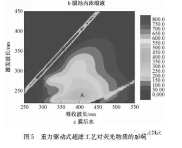 采用三維熒光光譜方法可以高效監(jiān)測水中不同類型的熒光有機物的遷移轉(zhuǎn)化規(guī)律。如圖5所示,通過定性分析,可以發(fā)現(xiàn),膜池中蛋白類有機物質(zhì)含量有所增長,這是由蛋白類物質(zhì)相對分子質(zhì)量較高,被超濾截留后在膜池內(nèi)累積造成的。另一方面,超濾膜膜后水的蛋白類和腐殖質(zhì)類物質(zhì)的濃度均大幅下降,只是在腐殖酸區(qū)域出現(xiàn)微弱的峰。這說明重力驅(qū)動式超濾工藝對于去除原水中有機物有較好的效果,可以有效保障出水水質(zhì)。