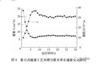 低壓重力驅(qū)動式超濾工藝作為一種新的超濾工藝運行方式,利用表面濾餅層中生物作用可以用以簡化超濾運行設(shè)備,降低物理和化學清洗產(chǎn)生的費用。另一方面,重力驅(qū)動式超濾工藝長期穩(wěn)定的運行說明針對引黃水庫水這一北方特殊水質(zhì),低壓重力驅(qū)動式超濾工藝具有很好的處理效果。