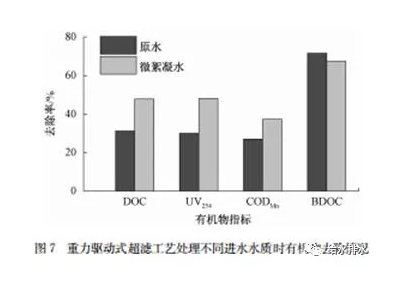 低壓重力驅(qū)動式超濾工藝運行30 d后,改變進水水質(zhì),即向原水中投加2 mg/L的聚氯化鋁(PAC),經(jīng)過快速混合通入超濾膜池中。重力驅(qū)動式超濾工藝處理經(jīng)過微絮凝的原水依然可以保證穩(wěn)定通量,工藝運行3 d后,監(jiān)測重力驅(qū)動式超濾工藝處理微絮凝水的凈水效能。微絮凝原水條件下,工藝對濁度和微生物指標的控制效果較好,出水濁度控制在0.1 NTU以內(nèi),菌落總數(shù)指標均控制在2 CFU/mL以內(nèi)。此外,如圖7所示,比較了2種進水水質(zhì)條件下,超濾工藝對有機物的去除情況??梢钥闯?,經(jīng)過微絮凝水處理后,超濾工藝對DOC、UV254和CODMn的去除效果均有所提升,去除率分別提升了16.6%、18.2%和10.6%。這說明原水經(jīng)過微絮凝處理協(xié)同重力驅(qū)動式超濾工藝對于改善出水水質(zhì)有很好的促進作用。