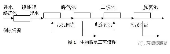 在污水的生物脫氮處理過程中,首先在好氧條件下,通過好氧硝化菌的作用 ,將污水中的氨氮氧化為亞硝酸鹽或硝酸鹽 ;然后在缺氧條件下,利用反硝化菌(脫氮菌)將亞硝酸鹽和硝酸鹽還原為氮氣而從污水中逸出。因而,污水的生物脫氮包括硝化和反硝化兩個階段。生物脫氮工藝流程見圖1 。